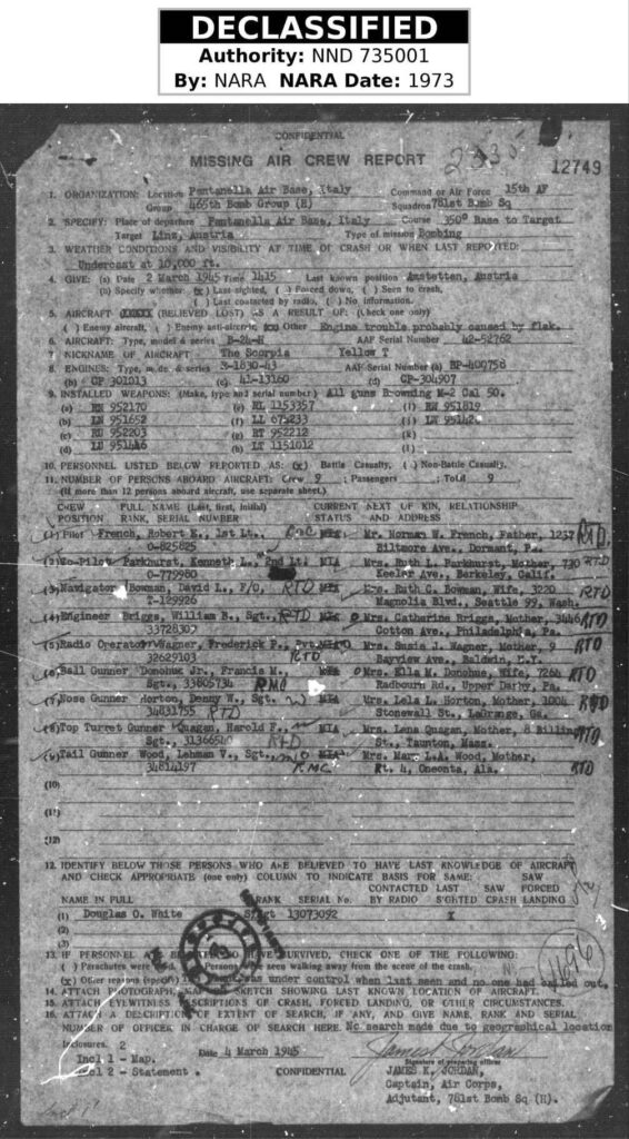A letter arrived in my parents’ mailbox from the Department of Defense. A Hungarian man had found my father’s plane, which had crashed and burned out in an open field. An amateur photographer interested in history, he took pictures of the plane, including its tail number, and sent a copy to the DOD. Did they know what had happened to the crew? Were they still alive? Could he contact them?