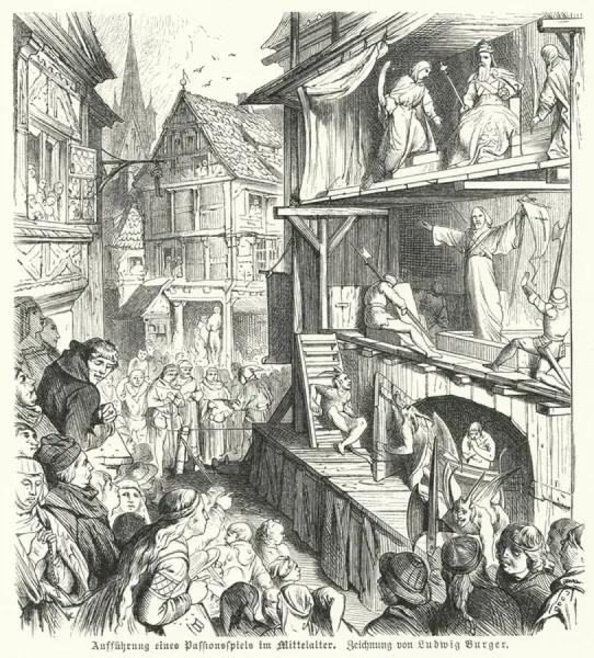 During the Middle Ages came the emergence of the Passion Play, sort of the first theatrical performances done by the laity, post Christian era before this re-evolved into theatre as we know it…