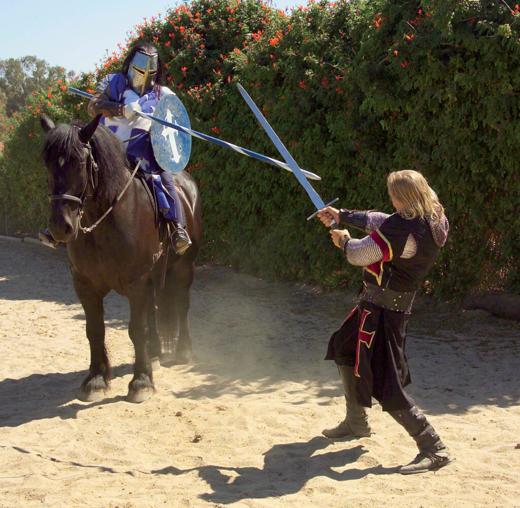 A broadsword is sharpened on both edges of its blade (unlike a kitchen knife that has one sharpened side). It is used one-handed, for the most part, the other hand being occupied with a long dagger called a main-gauche or a small shield known as a buckler. When you swung your blade you made the swash while you knocked your opponent with the buckler, hence swash-buckling. A broadsword is not elegant like a rapier or quick like a foil. It isn’t used in the same way. It is primarily a chopping weapon. It’s a sort of whack, whack, rest. Whack, whack, rest. Not what you see in the movies. It is 44 inches long and weighs about three pounds. Very handy as weapons go.