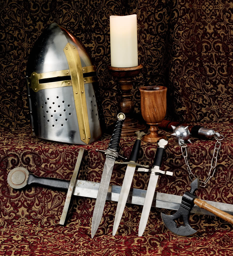 I am fascinated by medieval weaponry. Consequently, I have become the proud owner of three broadswords and a few daggers, as well as two helms, a battleaxe, and a flail (one of those nasty war weapons with a spiked ball on a chain attached to a stick. Sweet!) These are all reproductions, I am quick to add. Not only would the real thing be prohibitively expensive, but many of these items did not survive to today except for some very rusted remnants.