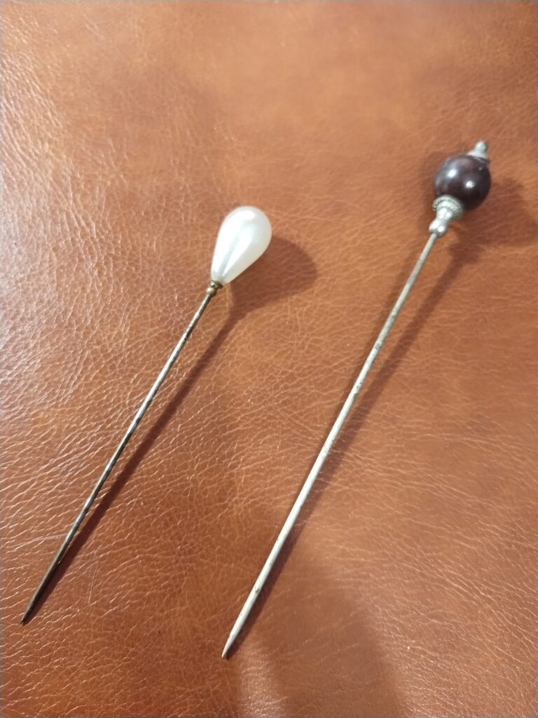 Hat pins were also part of life. These are two of mine, short late Victorian/early Edwardian hat pins. But many were much longer, as long as twelve inches. That would certainly keep a man at arm’s length.