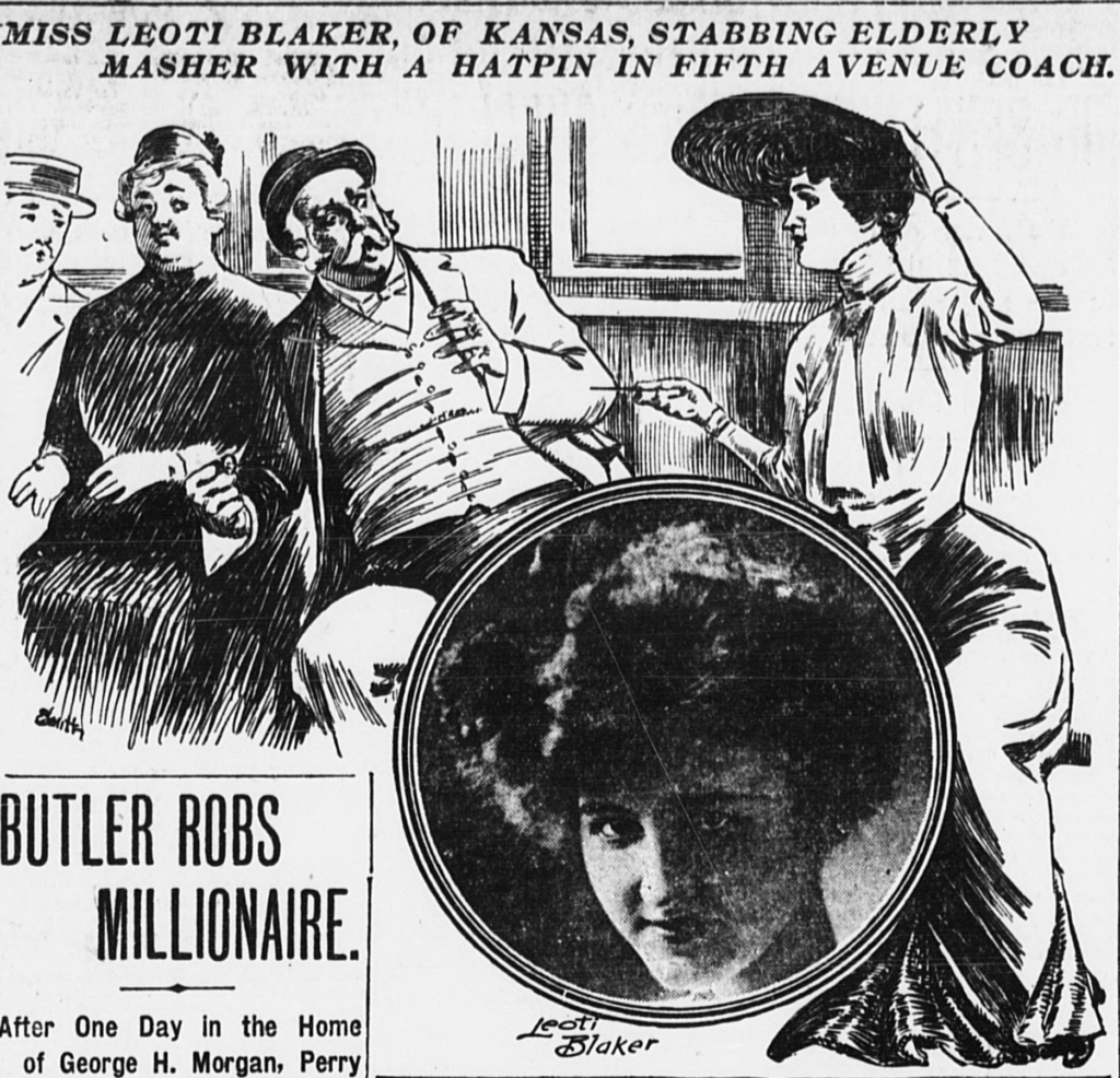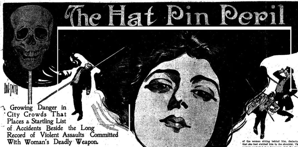 According to an article in Smithsonian magazine: ”A New York City housewife fended off a man who brushed up against her on a crowded Columbus Avenue streetcar and asked if he might ‘see her home.’ … A St. Louis schoolteacher drove her would-be attacker away by slashing his face with her hatpin…”